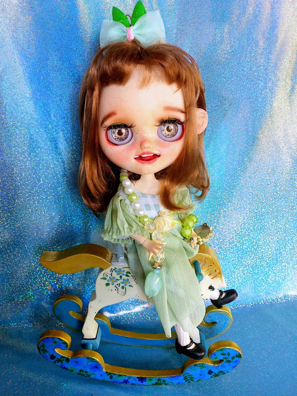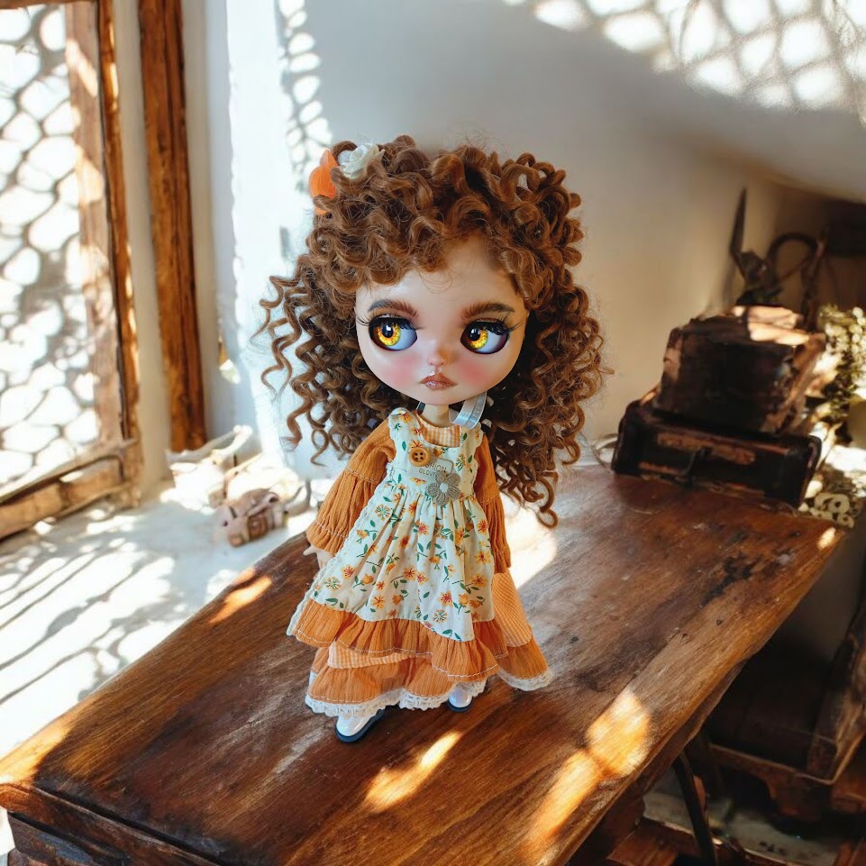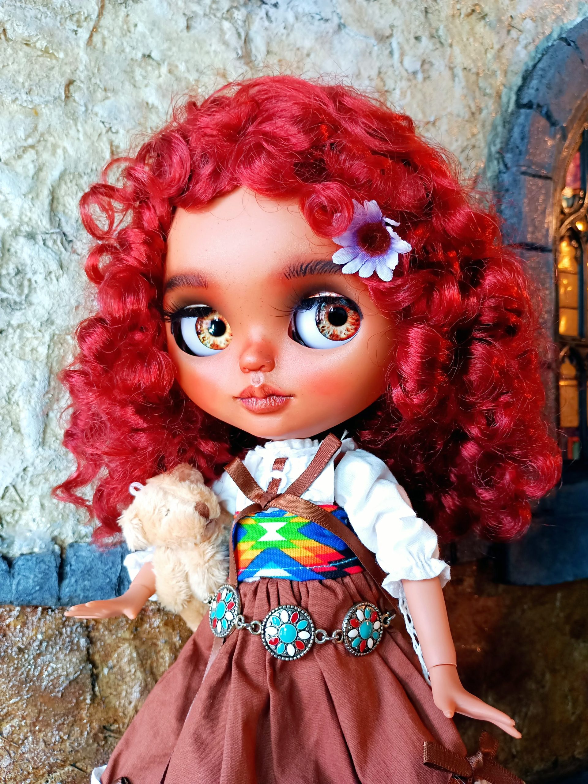 Handcrafted 12″ Blythe Doll About: This doll is uniquely designed and individually handcrafted. The doll has auburn curly mohair, a fake base and a 1/6 ball jointed body. The face plate has been modified/customized and is not factory perfect. Customization: This doll includes:Dress, apron, stockings and shoes. Doll hair: The hair is not rerooted,it is securely attached (glued)…