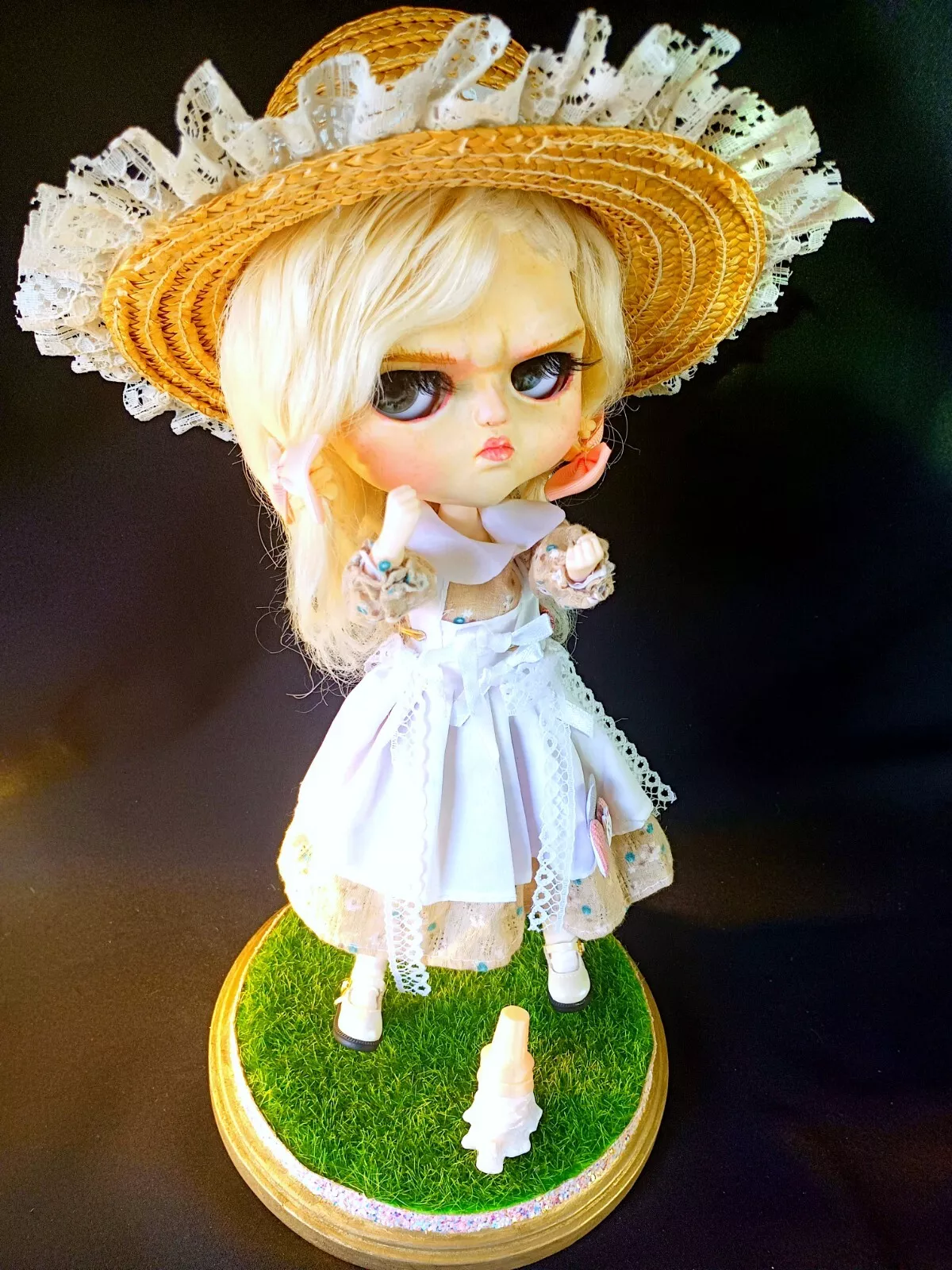 Handcrafted 12″ Blythe Doll About: This doll is uniquely designed and individually handcrafted. The doll has white curly Tibetan Sheep hair, a fake base and a 1/6 ball jointed body. The face plate has been modified/customized and is not factory perfect. Customization: This doll includes:Dress, mourning veil, shoes, an LED candle and a custom wooden stand.…