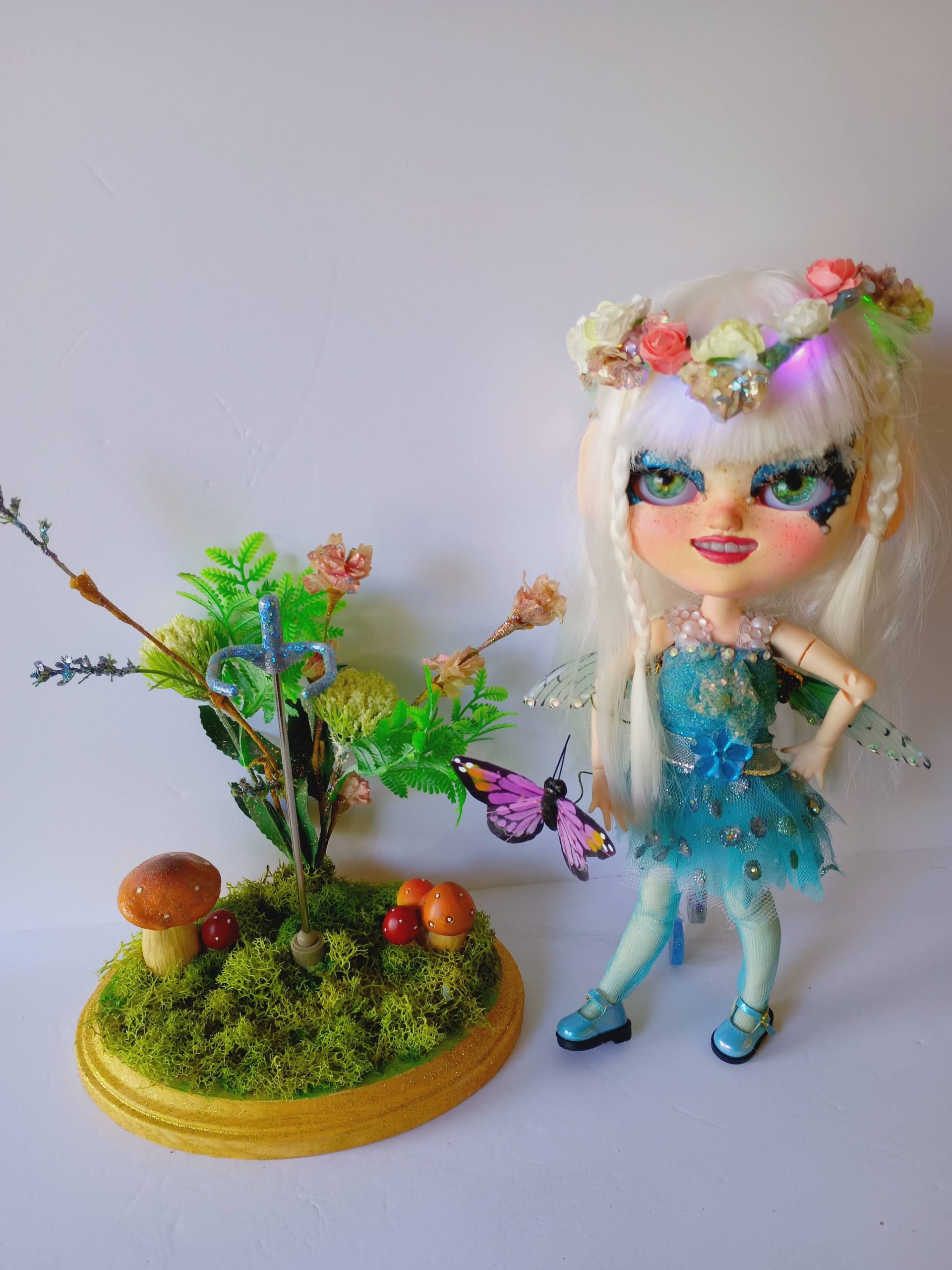 Handcrafted 12″ Blythe Doll Blue Fairy Blythe Doll About: This doll is uniquely designed and individually handcrafted. The doll has Tibetan Sheep hair which has been stitched and glued to the skull cap. It has a fake base and a Jointed 21cm 1/6 Ball Figure Body. It has been modified/customized and is not factory-perfect. Customization: This…