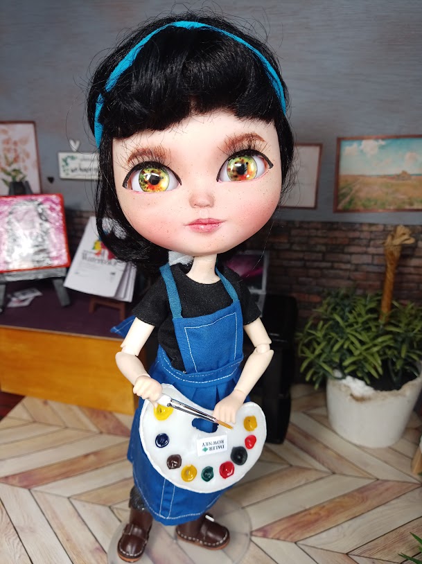 The doll comes with an extra set of hands, a headband, pants, a shirt, an apron, boots, an easel, a painting pad, a paintbrush, a pallet with watercolor paint, and a stand.
