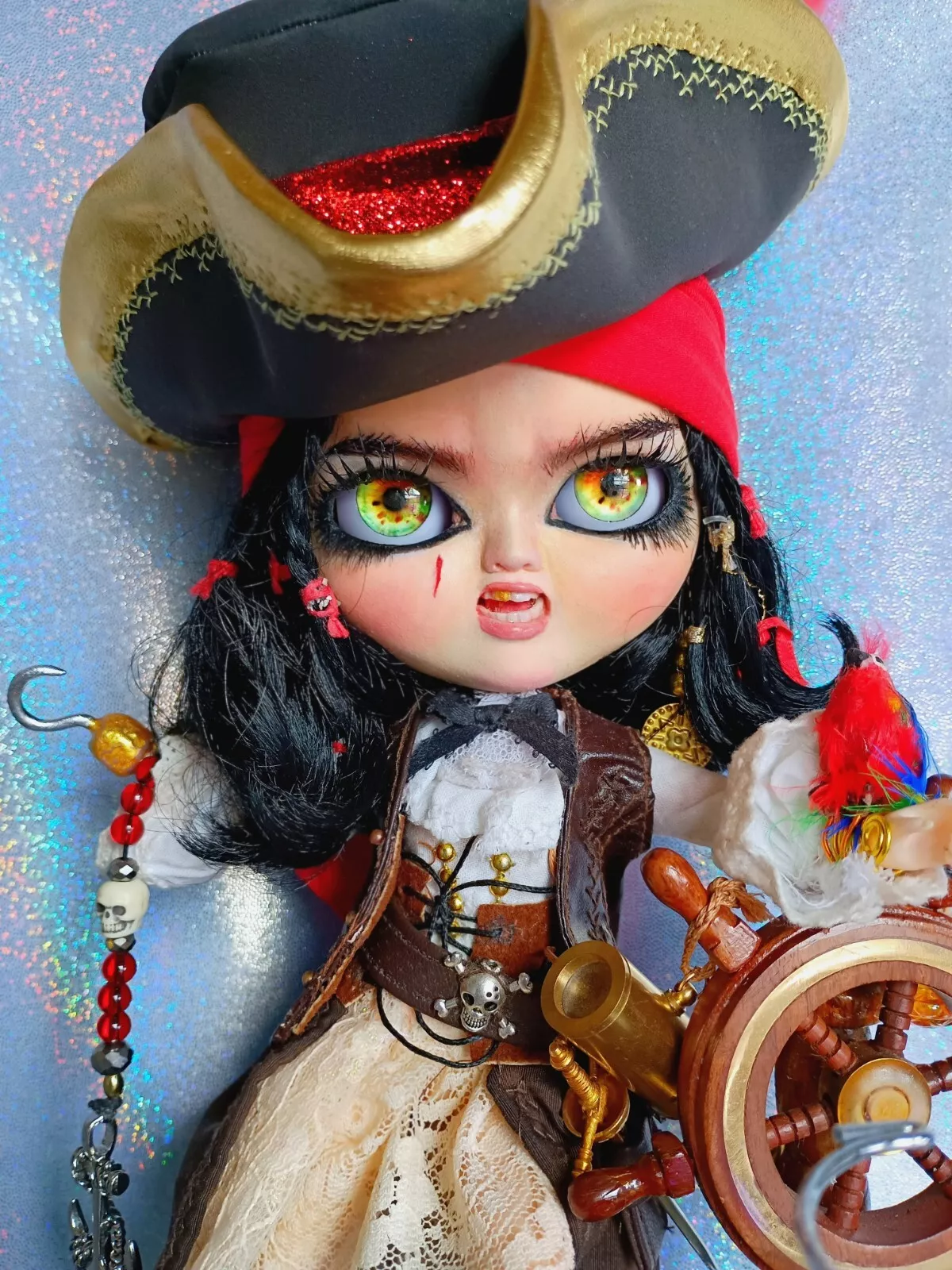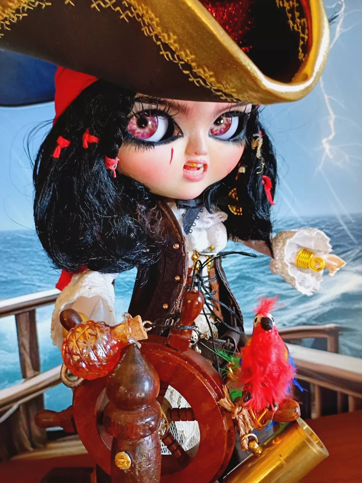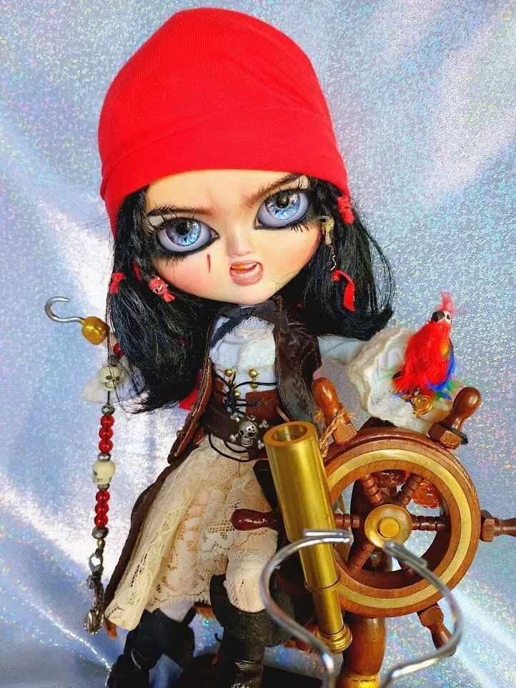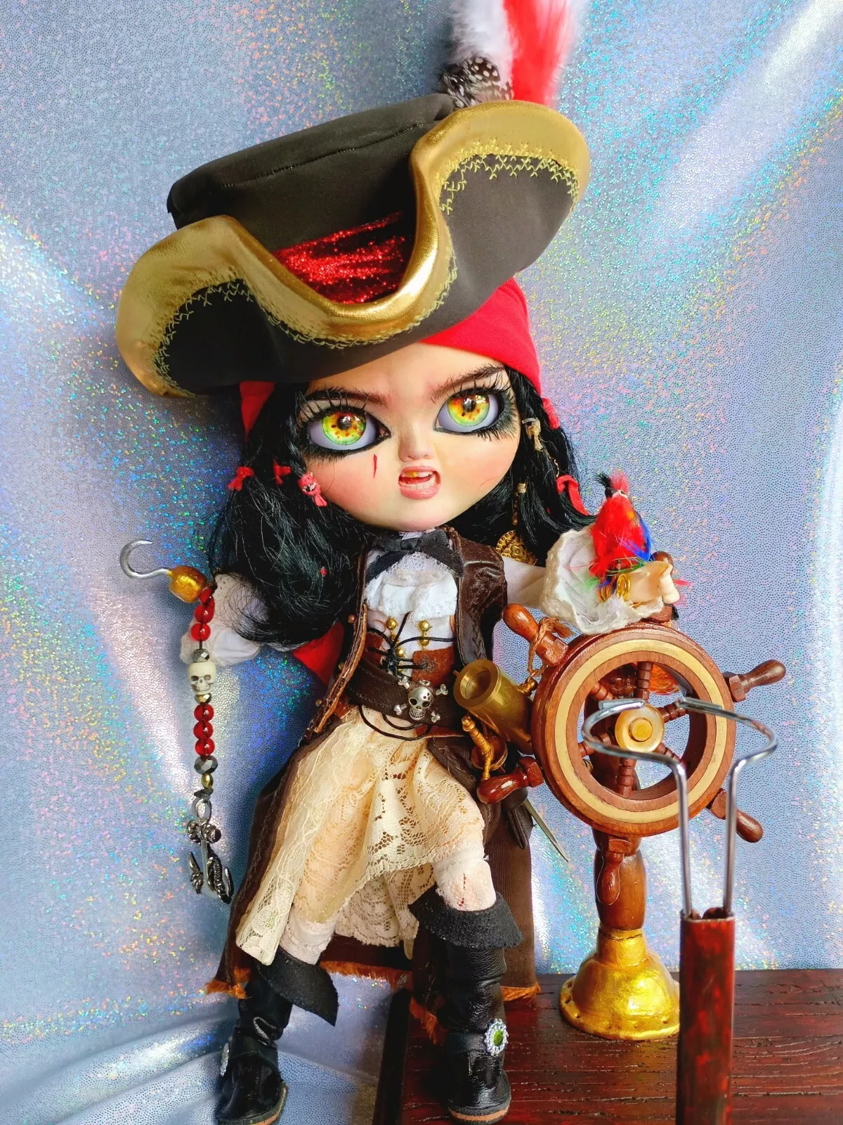 Doll, shirt, leather (upper) skirt, lace knee-high socks, poly/cotton & lace petticoat, leather & faux leather boots, faux leather hat with various feathers, faux leather vest, metal sword (Toledo), faux leather sword belt (with skull charm), earrings, metal hook/hand (detachable), metal (retractable) telescope, rum bottle, & custom wooden ship helm stand & parrot.