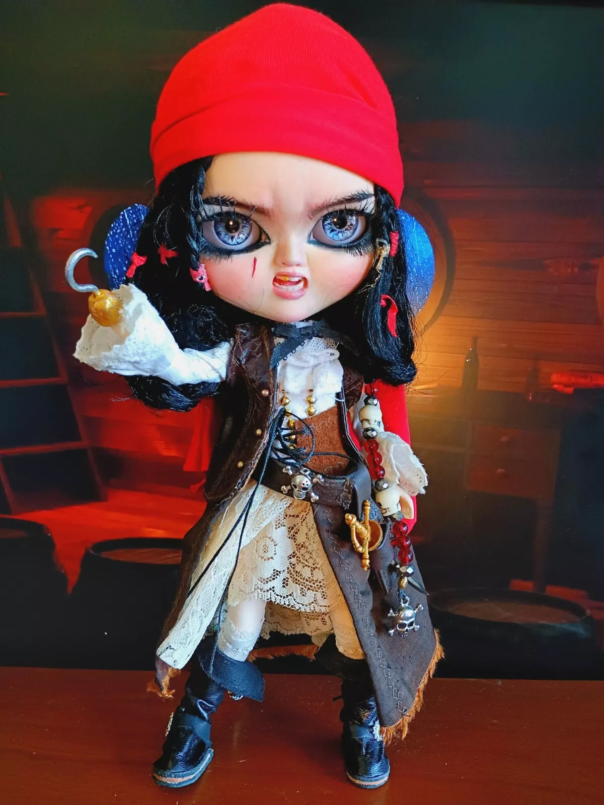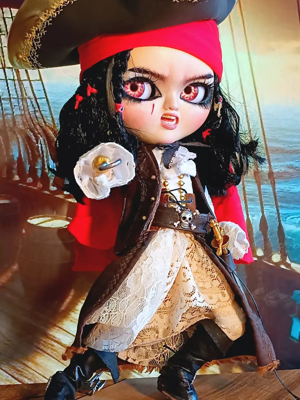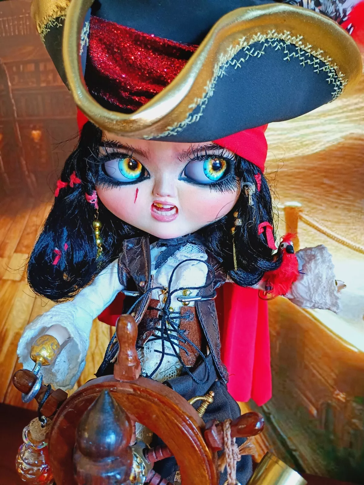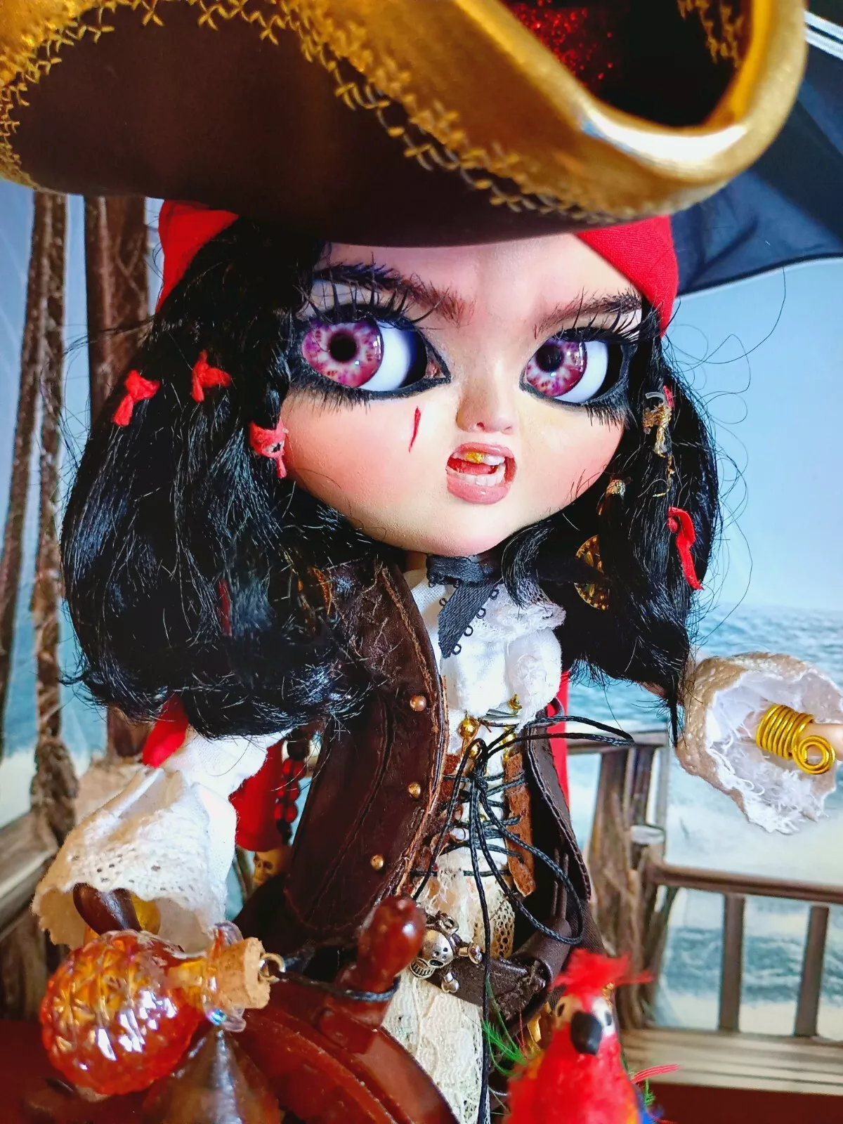 Doll, shirt, leather (upper) skirt, lace knee-high socks, poly/cotton & lace petticoat, leather & faux leather boots, faux leather hat with various feathers, faux leather vest, metal sword (Toledo), faux leather sword belt (with skull charm), earrings, metal hook/hand (detachable), metal (retractable) telescope, rum bottle, & custom wooden ship helm stand & parrot.