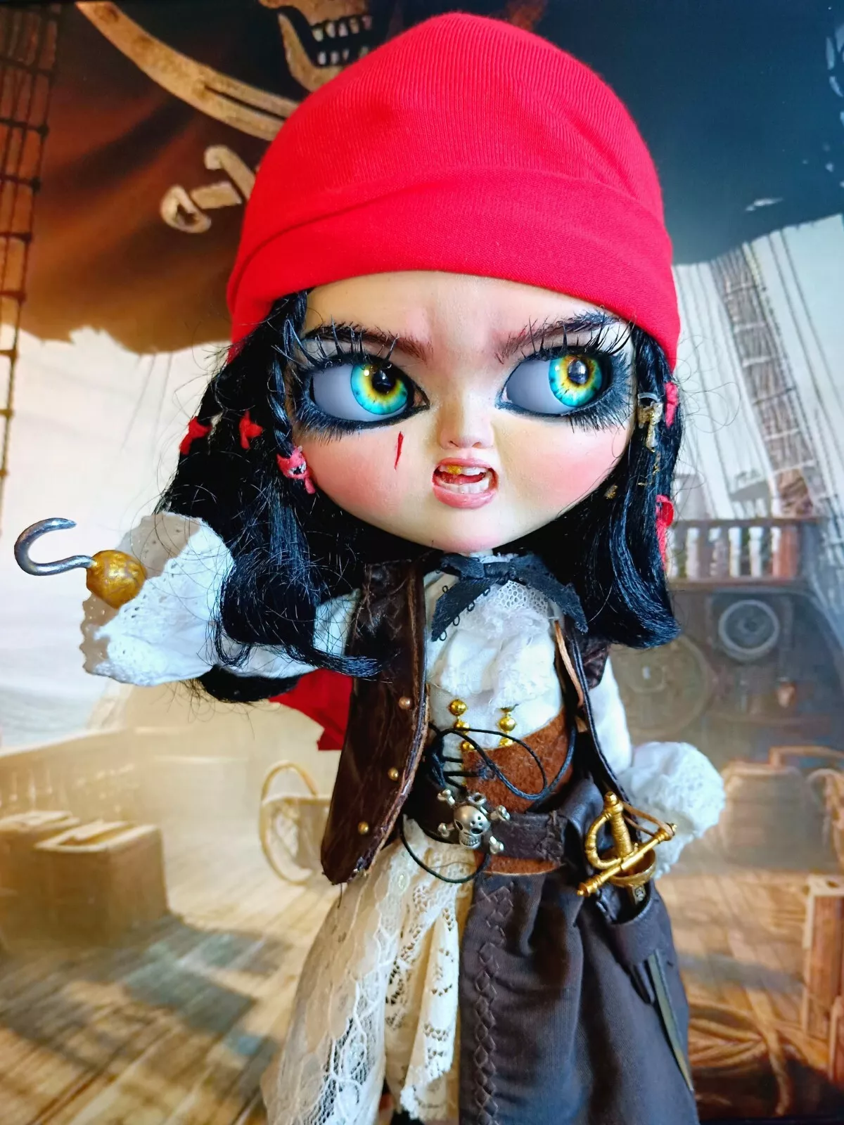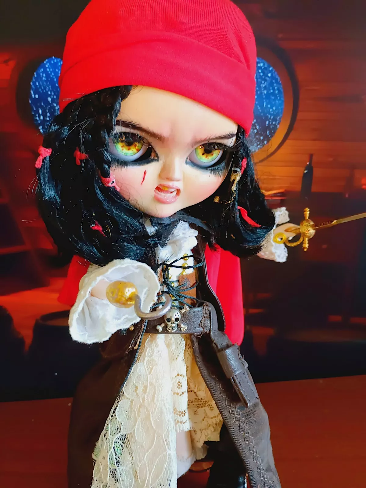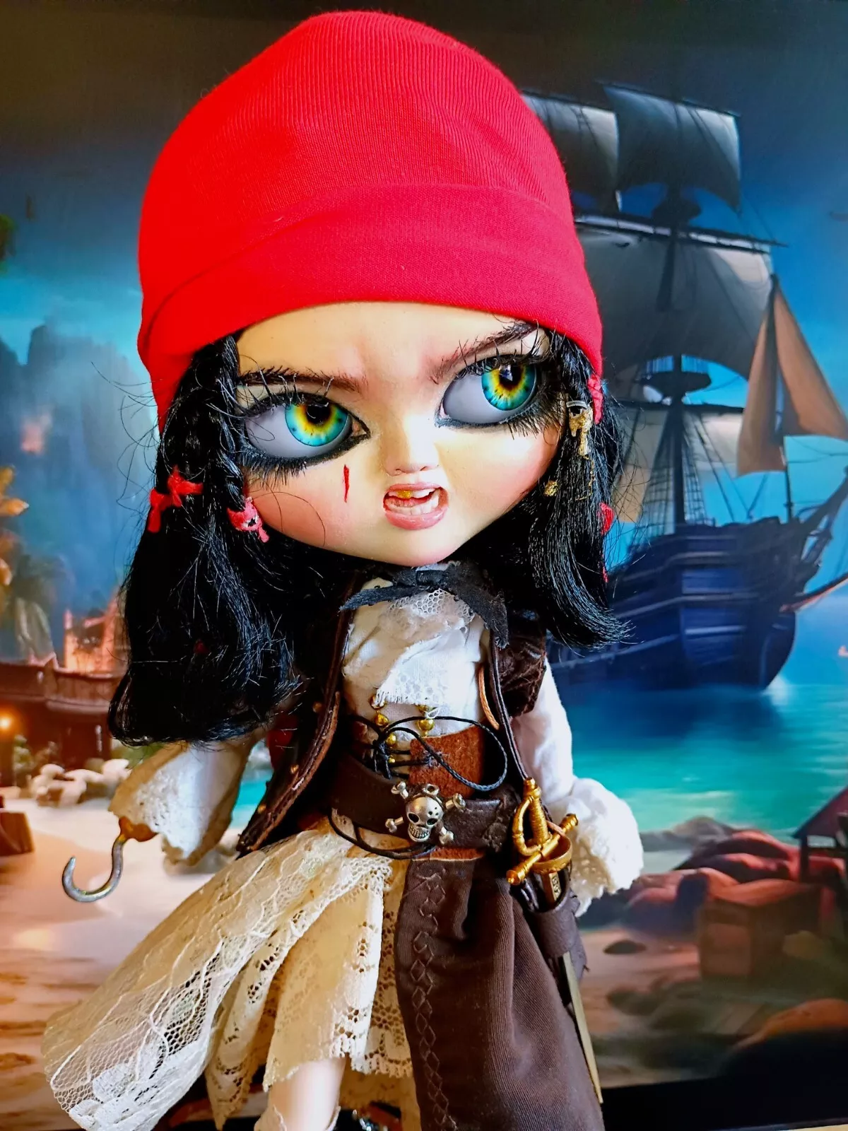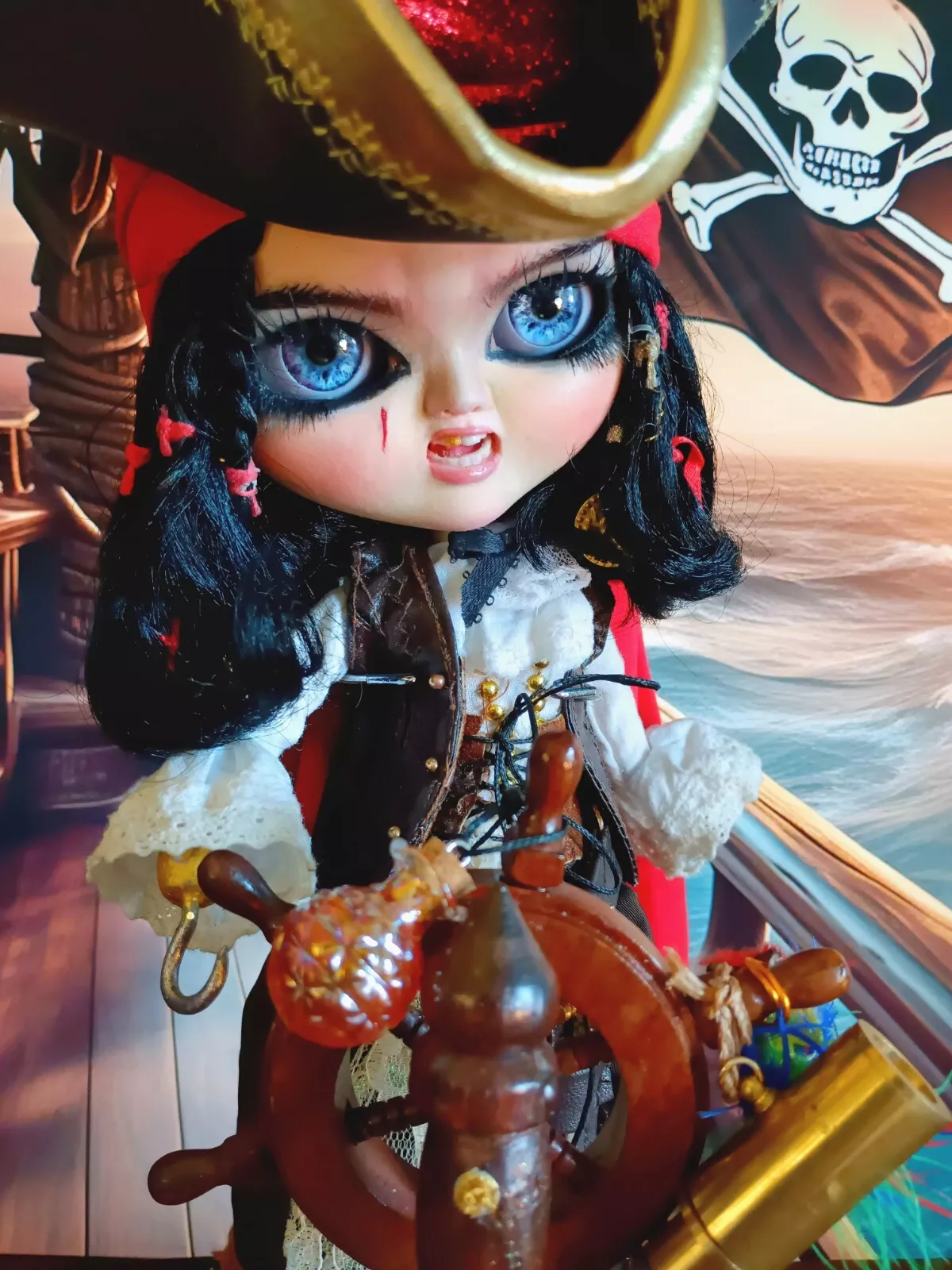 Doll, shirt, leather (upper) skirt, lace knee-high socks, poly/cotton & lace petticoat, leather & faux leather boots, faux leather hat with various feathers, faux leather vest, metal sword (Toledo), faux leather sword belt (with skull charm), earrings, metal hook/hand (detachable), metal (retractable) telescope, rum bottle, & custom wooden ship helm stand & parrot.