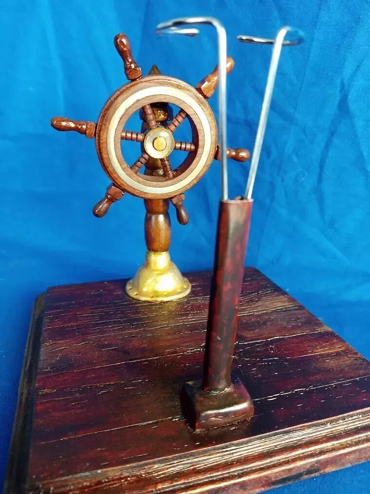 The outfit was completely handmade and the stand is a 6.6-inch (17cm) square laser-engraved Pine wood base. The ship wheel is 4″ Rosewood crafted with a brass ring. The stand was stained and sealed with polyethylene.